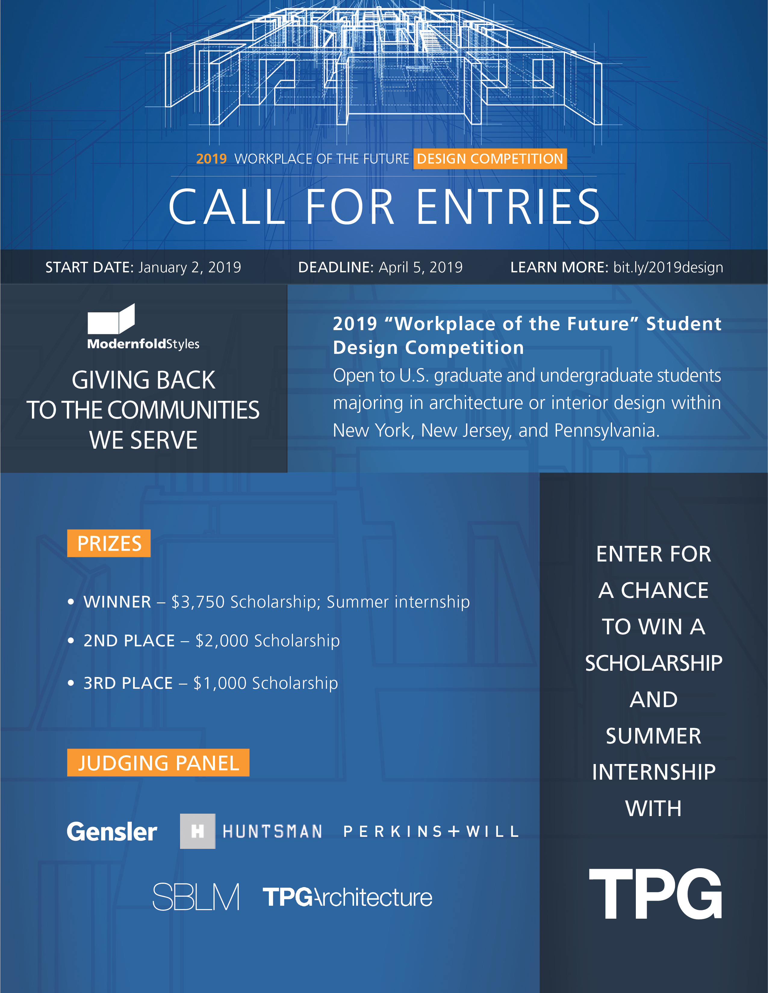1. Eligibility. You must be 18 years of age or older and attending an accredited school within the New York, New Jersey, and Pennsylvania area majoring in architecture or interior design. Entrants must also be attending school in the Fall Semester of 2019.