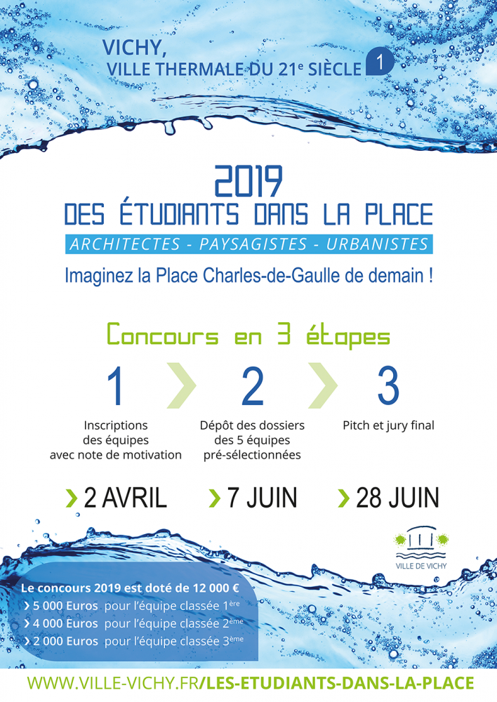 Concours organisé dans le cadre des réflexions menées avec l’ensemble des partenaires de «l’action cœur de ville». Il entend attirer l’attention des étudiants sur un thème de société : la métamorphose d’un cœur urbain. «Ville Thermale du 21ème siècle, Imaginer la Place Charles de Gaulle de demain»: face aux grands enjeux internationaux, les espaces de vie(s) se réinventent. Quels espaces publics pour une ville qui s’inscrit avec 11 villes européennes dans une démarche de labellisation UNESCO ?