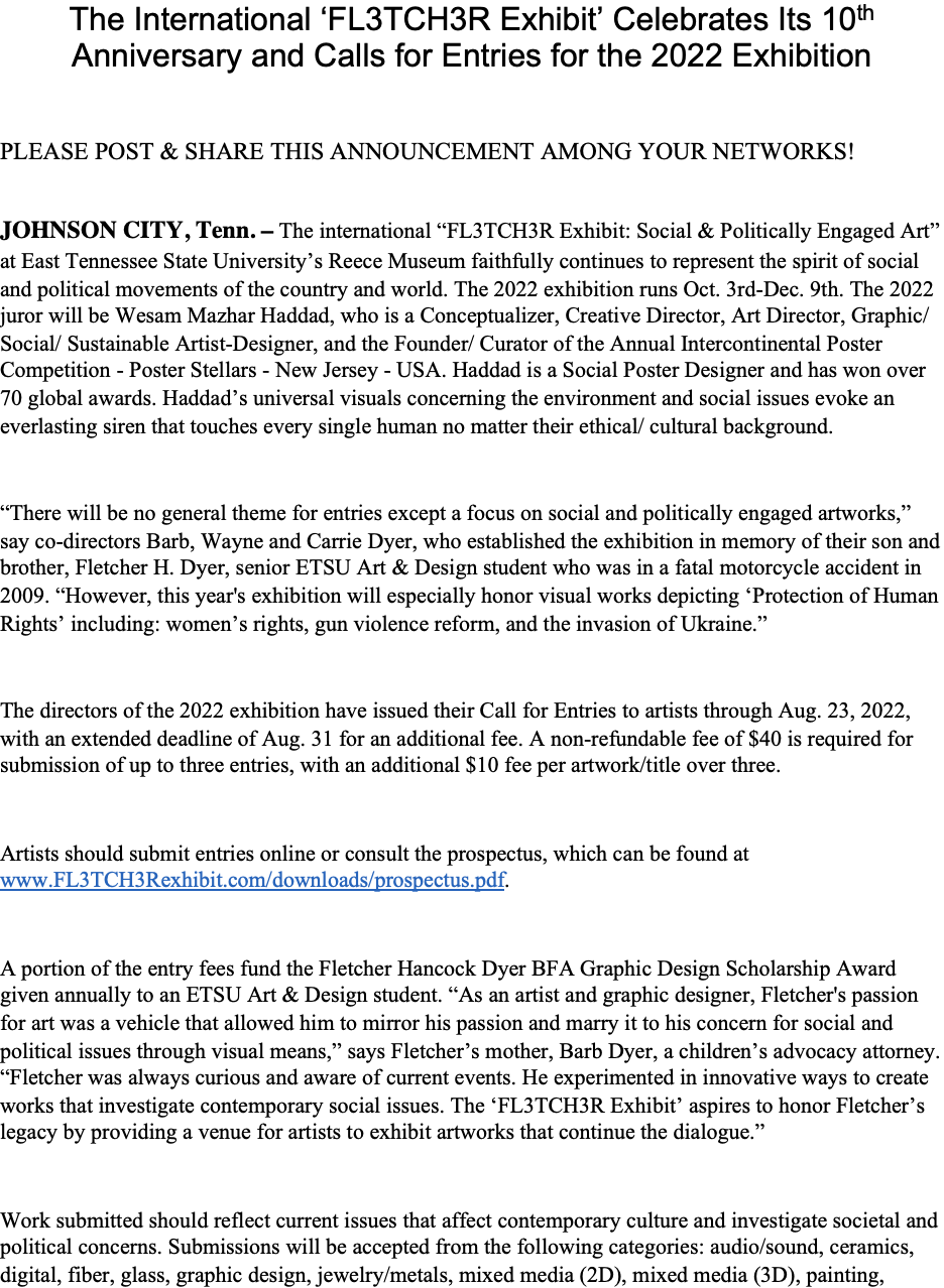 The 11th Annual 2023 FL3TCH3R EXHIBIT is an international juried exhibit focused on social & politically engaged art. These collective creative works serve as an avenue for societal transformation & exposure of social & political points of view. The goal is to recognize & advance this endeavor by providing a venue for the exhibition of socially & politically engaged art. The exhibit’s proceeds after expenses fund the Fletcher H. Dyer Scholarship for an Art & Design Student.